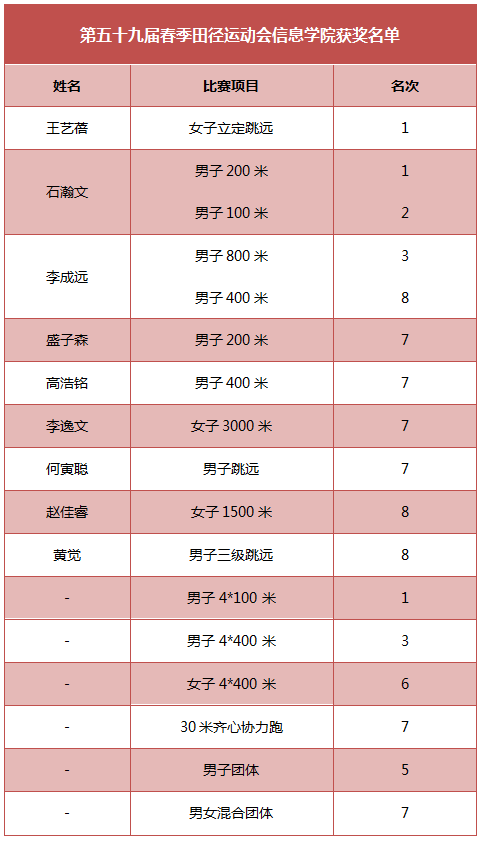 信院从来卧虎藏龙,一位位运动健儿为我们展现了不俗的实力,不断让人眼前一亮。beat365官网李成远同学夺得男子学生组800米第三名,400米第八名。石瀚文同学更是一马当先,优势明显地从群雄中脱颖而出,拿下200米短跑冠军和100米亚军。王艺蓓同学以2.31米的绝对优势在女子学生组立定跳远比赛中一举夺魁。男子跳远中,何寅聪斩获第七,黄觉在三级跳中发挥稳定,获得第八。而在长跑这样一个十分考验选手耐力和体力的项目中,运动员们同样表现出色。李逸文同学、陆绿同学始终坚持,分别获得男子3000米长跑第七、第十一名的好成绩。赵佳睿同学在女子组1500米长跑勇夺第八。在男子学生组5000米长跑比赛中,在身体和心灵的双重考验下,beat365官网黄亦嵩同学、董艳峰同学、黄鹤同学更是不屈不饶,展现了信院人顽强拼搏的精神。