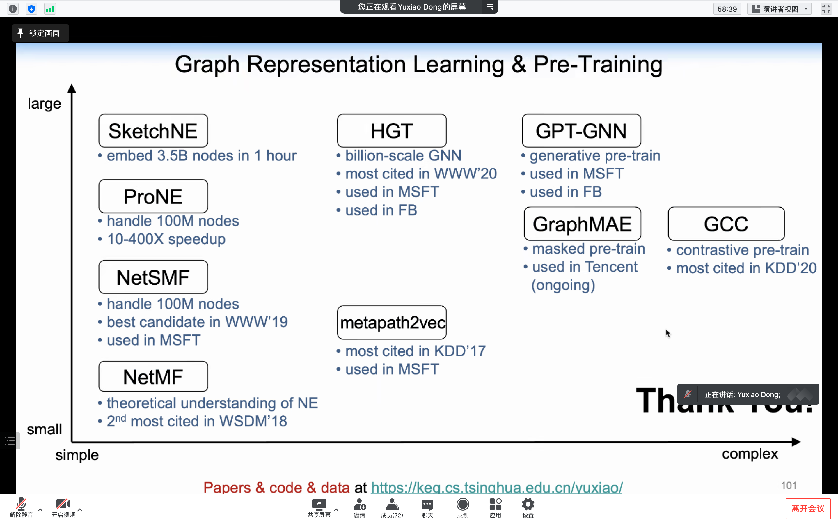 本次讲座东老师主要从解决大规模图的表示学习以及复杂图的表示学习任务方面分享了他们的一系列工作,并给出未来可能的研究方向。