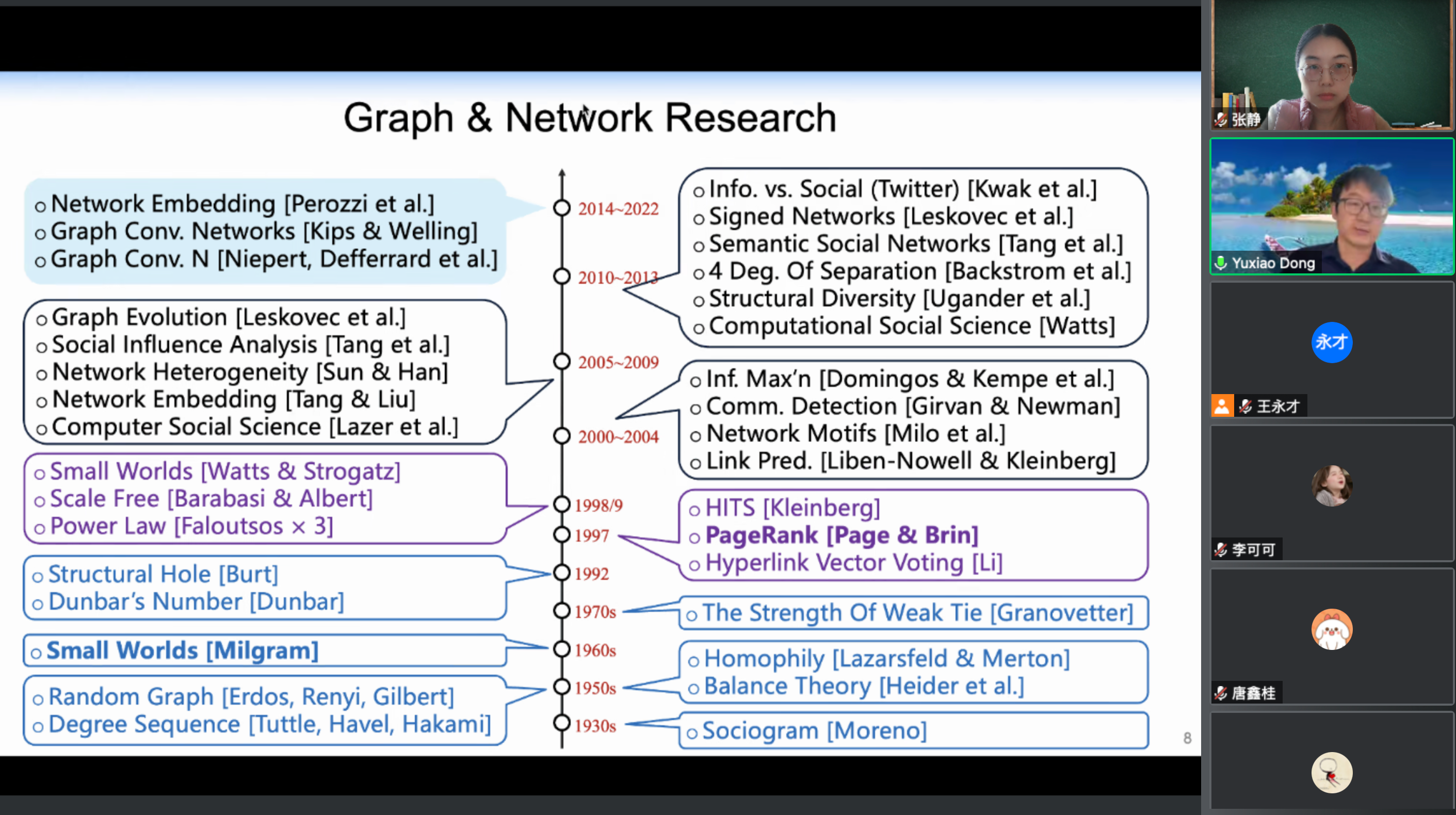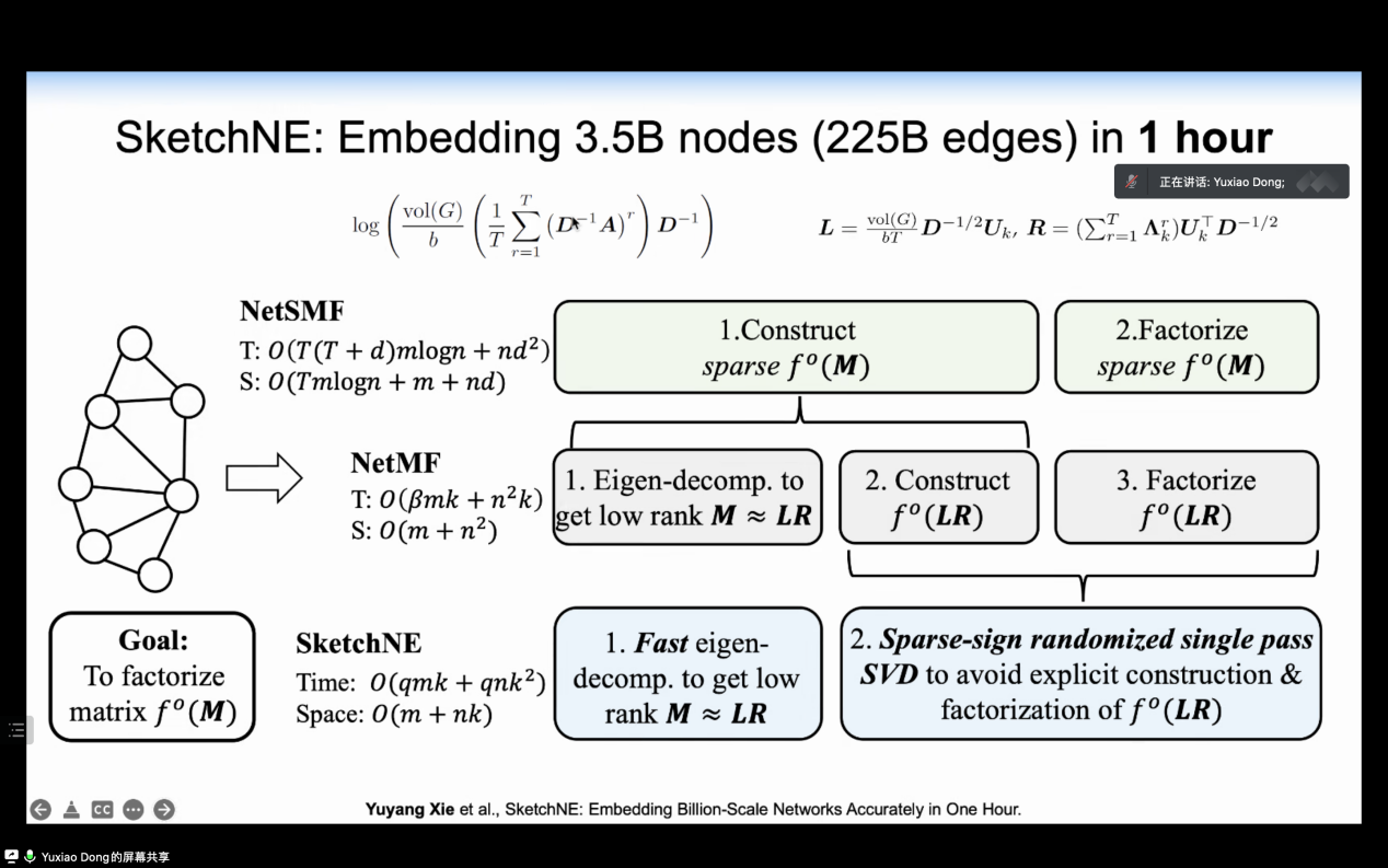 讲座伊始,东昱晓老师从图在生活中的运用切入,梳理了人类创造并运用图概念的历史进程,从而深入浅出地为阐明了图网络的思想。他在介绍了图表示学习经典方法的基础上,讲解了多个前沿工作。其中,采用randomwalk将图转化为序列并借助文本序列表示学习的思想表示图的结构,其缺陷是计算复杂度过高。为了应对这一挑战,东老师团队提出了稀疏的近似方法(NetSMF),大大提高了效率,sketchNE在此基础能够适应于更大规模图的表示学习。