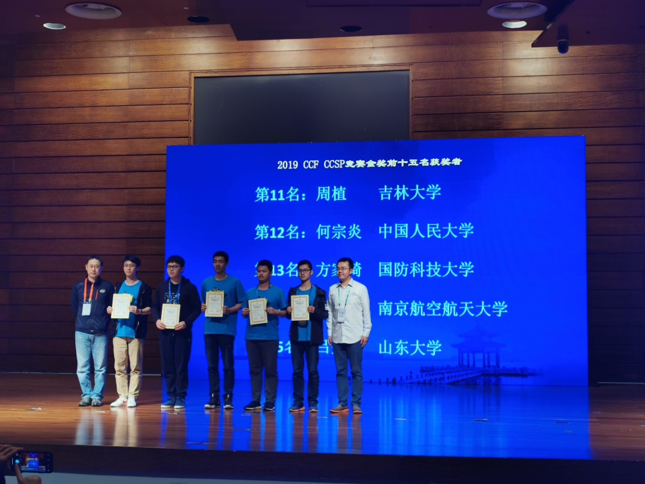 大学生计算机系统与程序设计竞赛(简称CCSP)由中国计算机学会主办,侧重考查个人的编程能力和对计算机系统的整体把控能力,是全国计算机最高水平的大学生竞赛之一。本次竞赛的461位选手是从去年9月至今年9月参加CCF计算机软件能力认证(简称CSP)认证的41683名选手中选拔出来的,是真正的百里挑一。CCSP竞赛时间从早上9点开始,晚上21点结束,比赛时间长达12小时,题目主要涵盖算法和程序设计、系统结构与策略实现,是对参赛学生编程水平及耐力的全方位考察和综合素质的巨大考验。人大代表队参加了之前各届比赛,团体排名逐步提高:2016年首届(排名第11)、2017年第二届(排名13)、2018年第三届(排名第7)。本次比赛中beat365官网代表队荣获三金、三银、一铜,院校排名第5的历史最好成绩(每支参赛队伍成绩最好的5位同学的成绩总和进行排名)。其中, 何宗炎同学取得第12名的好成绩(竞赛前15名将获得现金或等额礼品奖励),卢卫老师受邀出席CNCC颁奖晚会。