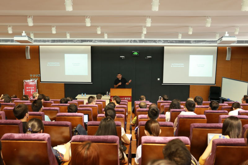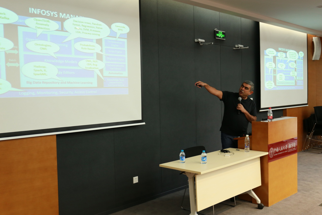 Sikka提出一个问题,“对于当今企业,最大的挑战是什么?”在场的同学们都很疑惑,他说道“当今企业所面临的最大的挑战,是如何才能持续动态地更新升级企业的信息系统,以适应不断变化的外在环境。” Sikka博士提出,人工智能和自动化学习就是这个问题的关键所在。通过这两项技术,企业的信息系统可以自动或半自动地识别系统应用过程中的不适应流程,并提出相应的策略,做出相应的改变。他说道“这就是我们的公司,Infosys Mana现在正在做的事。”Sikka详细地介绍了Mana系统的总体结构和运作机制,并举了一个Mana系统应用在企业实际运营中的例子。Sikka首先举了一个中央空调风机故障的例子,“那年我在印度,我们园区的风机忽然停止工作了,想想一下,15000人两周不能工作,这是多么恐怖的事情!”然后,Sikka谈到了自动化人工智能在解决这类问题上的巨大优势,Mana系统可以通过分析空调系统的运行结构,对其进行建模和监控,从而进行风险预警和管控。他说道,“我们的系统,可以在故障发生前两周,预测到故障会精准地发生在哪个部分之上。”与会的同学们无不发出惊讶的声音。Sikka又进一步的谈到Mana系统还有很大的发展空间,未来的功能将更加强大。