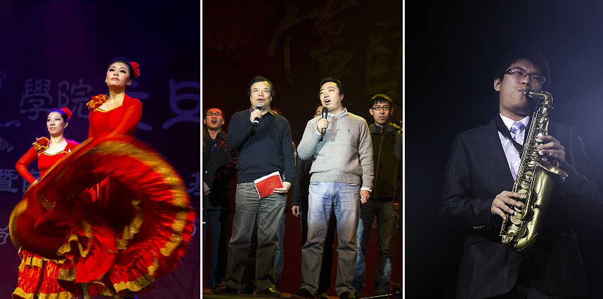 (图说:从左往右分别为学院女教师西班牙舞蹈,信息系师生歌曲合唱,校艺术团乐器联奏)