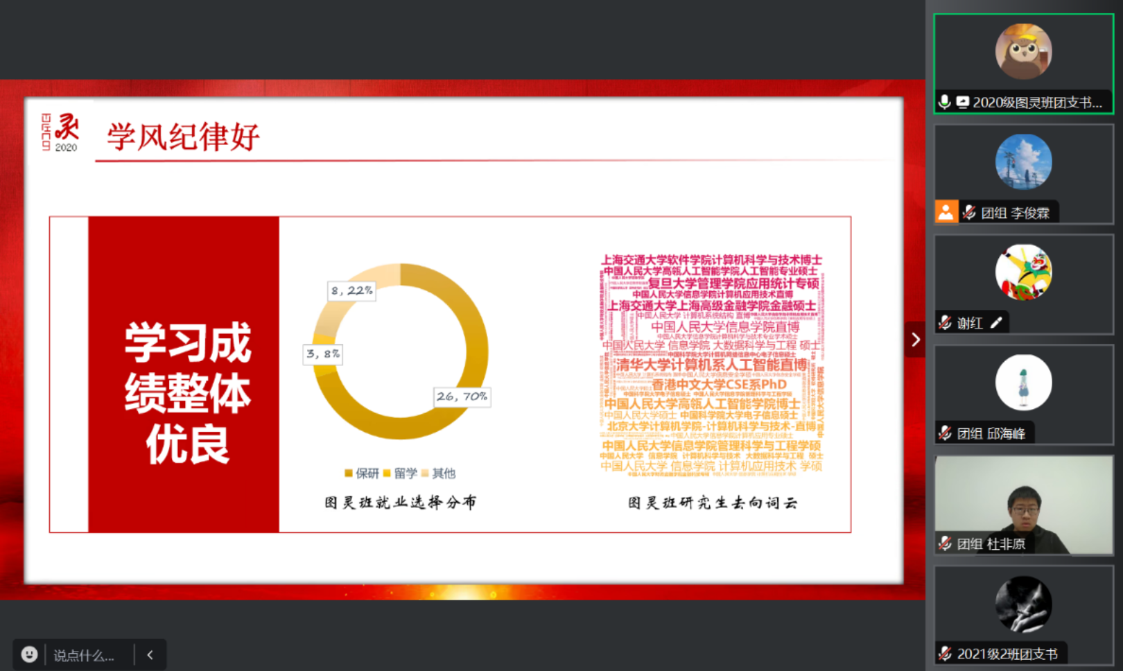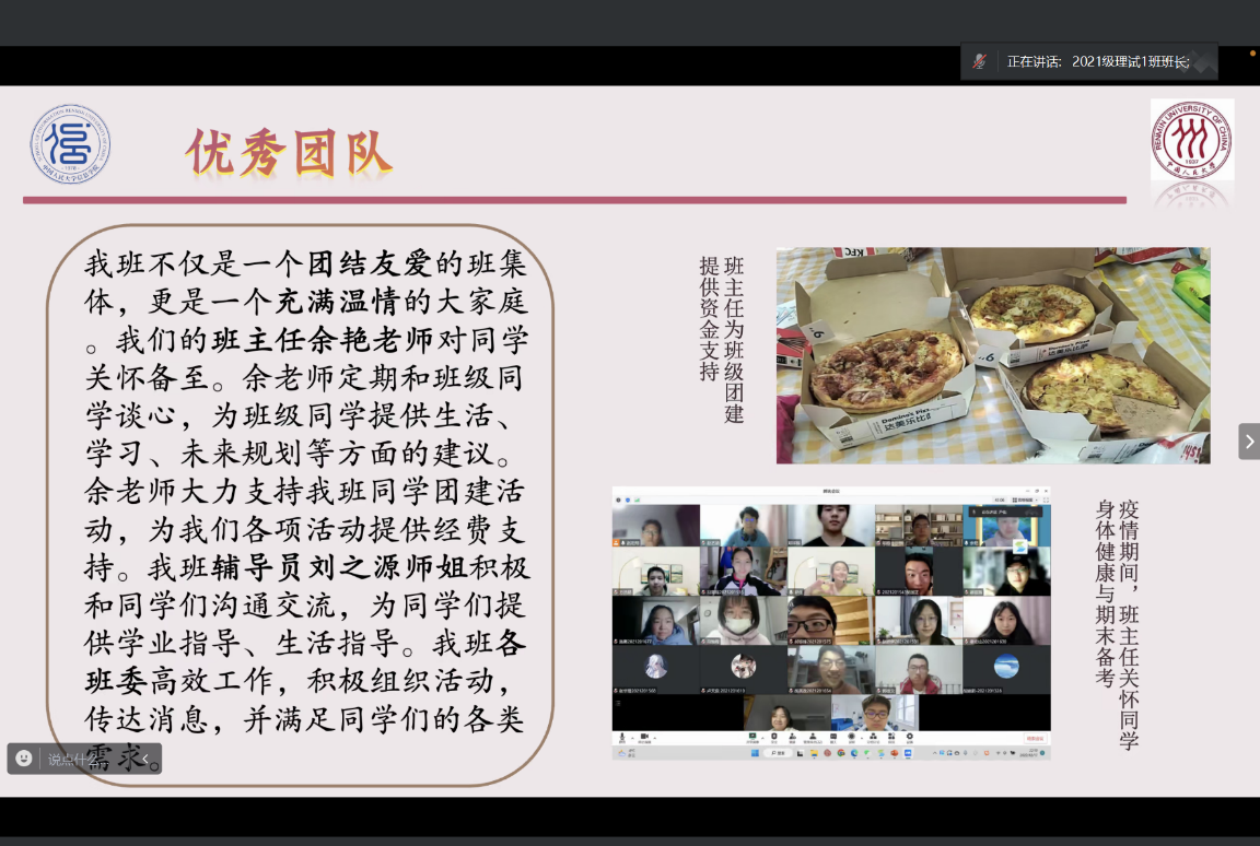 参与评选的各个班集体按照序进行班级风貌展示,通过PPT、短视频等方式,展示班级特色以及班级成就。各个班级分别从思想引领、队伍建设、组织活力、学风纪律、示范带动五个方面出发,介绍了各班党团建设情况、同学们的学业成绩、竞赛获奖情况和科研经历,从为提升凝聚力而进行的各种团队建设等方面,展现了努力学习、争优创先、团结友好的良好班级风貌。