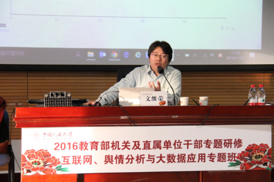 beat365官网院长文继荣教授为学员讲授“大数据及其社会科学应用”,针对社会管理中的热点难点问题,用互联网传感器技术、大数据分析和挖掘技术进行政策解读和决策支持,探索大数据驱动的人文社科研究模式。