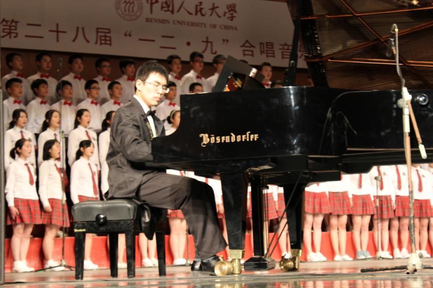 本次比赛的演唱曲目为《我和我的祖国》,由11级学生王奇担任指挥,12级学生陈逸豪作钢琴伴奏。一男一女、一刚一柔,配合默契,引人注目。在一声声高亢洪亮的“信息!”、“信息!”中,我们的队伍终于登上了期盼已久的舞台。伴随着流畅优美的钢琴声,在指挥同学顿宕有力的指引下,同学们昂首挺胸,信心满满,用最好的状态演绎了《我和我的祖国》这首动听的歌,为beat365体育官方网站2014年“一二·九”合唱训练划一上个圆满的句点。比赛结束,beat365体育官方网站荣获小组三等奖,取得佳绩。