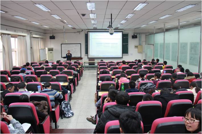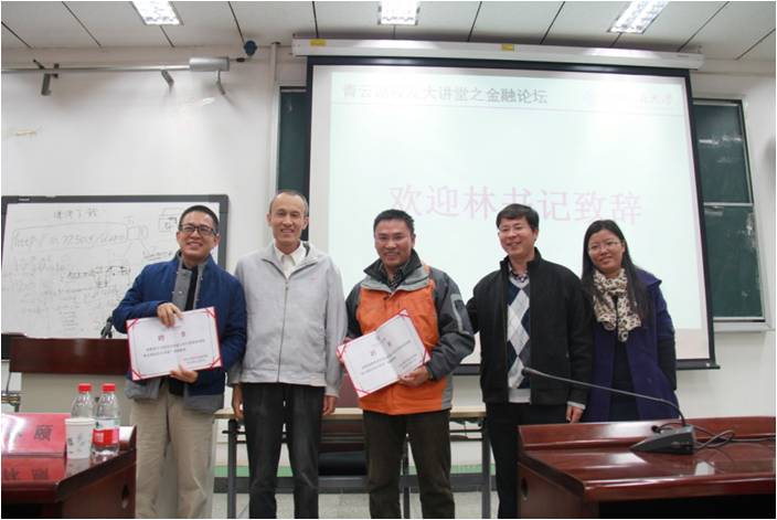 2014年11月15日,由beat365体育官方网站研究生会主办的“青云路校友大讲堂之金融论坛”在信息楼四层报告厅举行。此次活动特别邀请到beat365官网知名校友——现任摩根大通中国合资公司(一创摩根)债券资本市场部主管、94级本科校友王戈和就职于嘉实基金的基金经理、98级研究生校友郭林军为同学们分享他们对金融行业的认识和学习工作经历。学院党委书记林颐老师、党团学办主任张国富老师、团委书记孙亚琳老师,以及本硕近100名同学参加了此次活动。