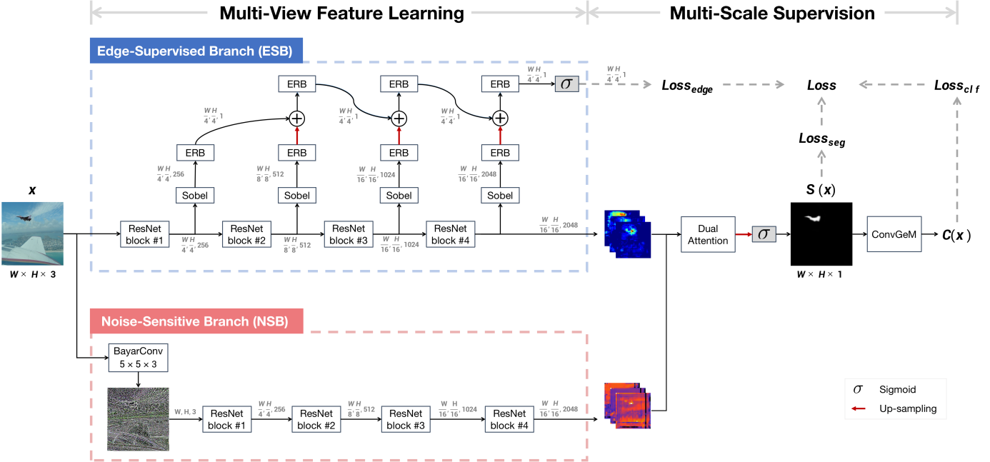 针对图像篡改检测任务,本工作提出了一种新的基于多视角(multi-view)、多尺度(multi-scale) 监督的图像篡改检测深度神经网络:MVSS-Net 。为了兼顾模型在篡改图像检测上的灵敏度和在真实图像上的特异度,MVSS-Net 一方面采用多视角特征学习提取语义无关的篡改边界特征和噪声分布特征,以提高模型的泛化性;另一方面采用多尺度监督对像素位分割、边界预测和图像级分类进行约束,使模型得以在训练过程中引入真实图片,减少虚警(false alarm)。