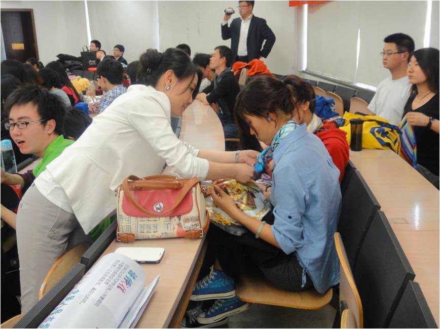 (图说:形象顾问老师教同学如何佩戴丝巾)