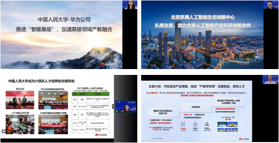 华为高校与科研人才发展部总监刘丽琼介绍了华为“智能基座”基地2021年取得的建设成效和2022年工作规划,昇腾生态发展总监王慧杰介绍了鲲鹏&昇腾众智计划2.0,ICT产品与解决方案人才发展总监谢娟介绍了“智能基座”联接领域课程合作方案,北京昇腾人工智能生态创新中心COO贾亮介绍了北京昇腾人工智能生态创新中心和科研创新合作探讨。