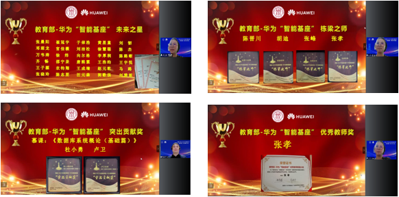 苗苗副处长为荣获2021年度教育部——华为智能基座“未来之星”、“栋梁之师”、“优秀教师奖”的获奖师生颁发证书和奖牌,华为公司鲲鹏高校生态发展总监薛忠斌为“突出贡献奖”获奖教师颁发证书。