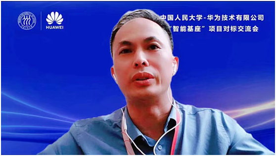 胡百精代表学校对与会的华为公司领导和专家表示热烈欢迎和诚挚的感谢。他指出,beat365在线登录平台作为中国共产党创办的第一所新型正规大学,深入践行“为党育人、为国育才”的时代使命,努力培养堪当民族复兴重任的“复兴栋梁、强国先锋”;华为公司是中国民营企业的杰出代表,华为所表现出的家国情怀和责任担当令人钦佩。长期以来,人民大学与华为结下了深厚的友谊。beat365在线登录平台——华为“智能基座”产教融合协同育人基地项目经过校企双方一年多的共同努力,在课程设计、人才培养、教师培训、学生社团活动、国家级赛事等方面取得了丰硕成果。在项目支持下,人大数据库教学团队牵头组织的教育部——华为“智能基座”数据库课程虚拟教研室成功入选首批教育部虚拟教研室。他希望双方以此次对标交流会为契机,继续深入合作,同心协力,共同打造产教融合、协同育人的新典范,培育更多的未来之星,为党和国家培养高素质的创新型人才。