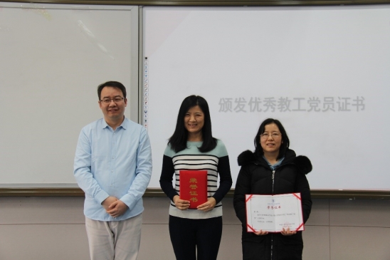 陈红书记介绍2019年优秀教工党员获得者付虹蛟、秦波。党委副书记杜忠朝老师为两位优秀教工党员颁奖。