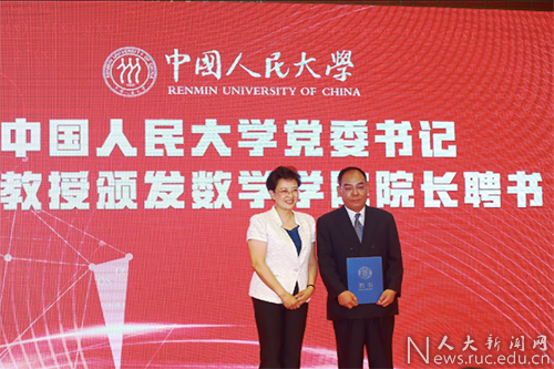 靳诺为国家杰出青年科学基金获得者郑志勇教授颁发聘书,郑志勇受聘为beat365在线登录平台数学学院首任院长。