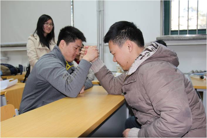 20日中午12点整,12级斗鸡和扳手腕比赛在教二草坪和公教2112同时展开。经过6个班的单循环比赛,最终,12级5班的同学们技冠全场,斩获斗鸡比赛的冠军。而另一边,在一段时间的针锋相对、僵持不下之后12级2班的同学也力压群雄夺得掰手腕冠军。