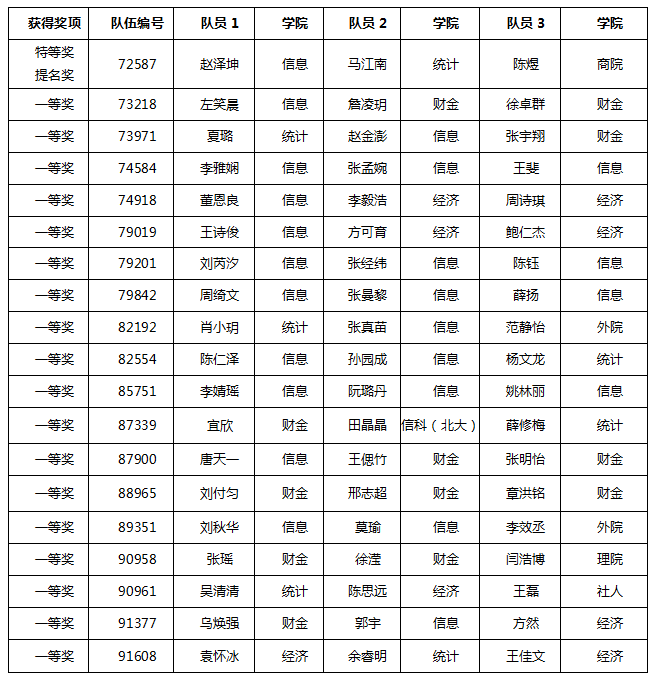在beat365在线登录平台所有参赛队伍中,共有60支队伍获奖。其中赵泽坤(beat365体育官方网站),马江南(统计学院)和陈煜(商学院)三位同学组成的队伍获得特等奖提名奖(Finalist,Winner,全球前23名),是继2014、2016年之后,第三次荣获该奖项。beat365官网获一等奖队伍数由2017年的13支队伍,增长至18支队伍,取得较大的进步,另有41支队伍获得二等奖,获奖队伍数连续增长。