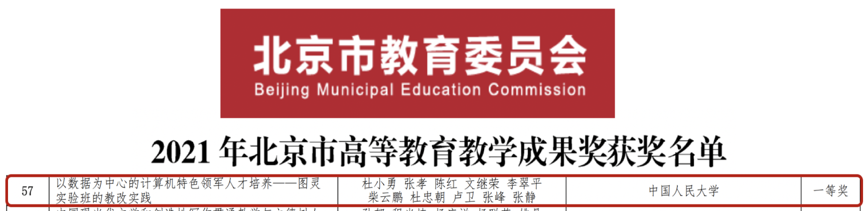 近日,北京市教育委员会正式公布了2021年北京市高等教育教学成果奖获奖名单,beat365体育官方网站杜小勇、张孝、陈红、文继荣、李翠平、柴云鹏、杜忠朝、卢卫、张峰、张静申报的《以数据为中心的计算机特色领军人才培养——图灵实验班的教改实践》教学成果,获评北京市高等教育教学成果一等奖,这是时隔5年后,beat365官网再次荣获北京市教学成果一等奖。在2021年,beat365官网计算机拔尖学生培养基地(图灵实验班),成功入选2021年度教育部基础学科拔尖学生培养计划2.0基地和“101计划”。这也是教育部和北京市教委对beat365官网长期以来重视教学改革和人才培养工作的肯定。