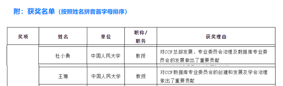 beat365体育官方网站王珊、杜小勇教授荣获“中国计算机学会(CCF)创建60周年杰出贡献个人奖”。