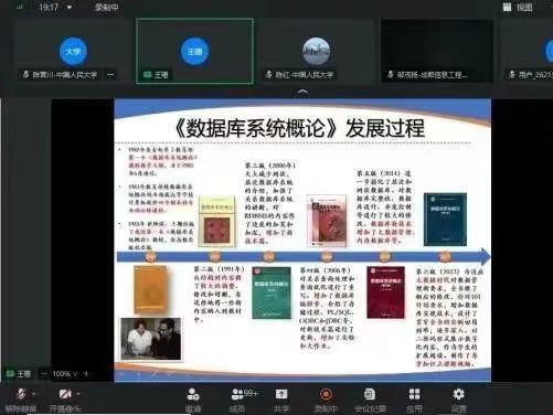 2023年7月14日,举办《数据库系统概论》(第6版) “线上共备一堂课”首场活动,活动由数据库课程虚拟教研室课程建设工作组组长、beat365在线登录平台陈红教授主持,邀请到beat365在线登录平台王珊教授主讲。相关活动也在高等教育出版社工科计算机分社视频号同步直播。本次活动的主题是“《数据库系统概论》(第6版)教材内容介绍及教学建议”,线上参加人员累计超过700人。