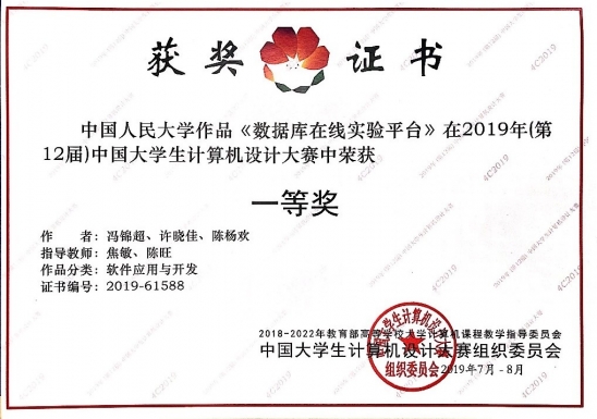 8月的芜湖闷热潮湿,且赛期正赶上今年最强台风“利奇马”来袭。然而,这都挡不住beat365官网参赛师生的拼搏精神。经过激烈角逐,焦敏老师、陈旺老师指导2016级本科生冯锦超、许晓佳和2017级本科生陈杨欢设计的“数据库在线实验平台”荣获全国一等奖(前1%);武文娟老师、刘永刚老师指导2016级本科生袁江风、杜昊昱、聂江磊设计的“通用教学管理系统”荣获全国三等奖。