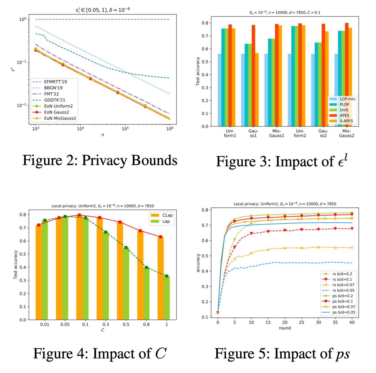 最后,我们在实验上验证了该框架的可行性,并展示了本文所提出的框架的隐私放大效果、截断拉普拉斯机制的特性、后处理的稀疏化策略的有效性。其中表3和图3展示了APES和S-APES在满足个性化本地隐私需求的前提下的高中心隐私水平和高准确性,且在多种本地隐私参数设置下都能达到良好的效果。图2中,在相同的本地隐私预算下,我们的方案达到的中心隐私损失最低,保护能力最强。且保护能力随着用户量n的增加而增强。图4验证了截断拉普拉斯机制在不同截断边界C下的可用性均可匹敌经典的拉普拉斯机制,且准确性随着C的增大而增加。最后我们在图5中展示了后处理的稀疏化策略的可用性,随着稀疏化程度增加,其准确性逐渐高于随机稀疏化这一基本方案。