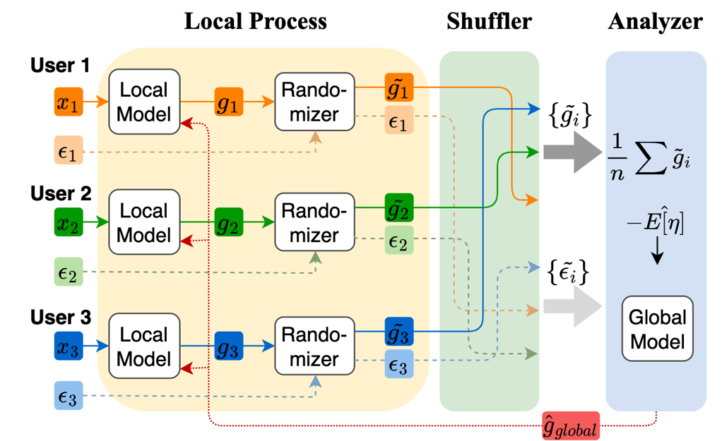 为解决上述问题,我们提出了个性化隐私保护的联邦学习框架APES,通过引入混洗服务器,同时对隐私参数和隐私数据混洗,放大全局模型的隐私性。
