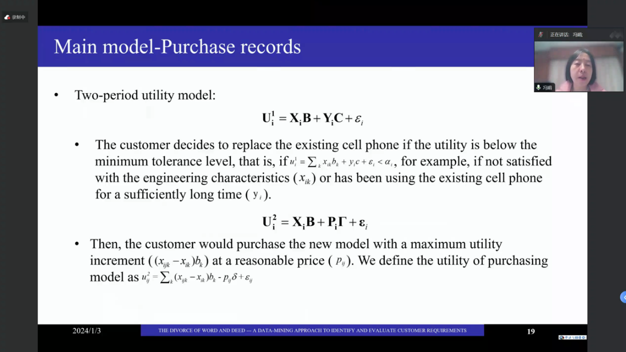 2024年1月3日星期三下午,beat365体育官方网站经济信息管理系组织了“信息系统双周论坛”第35讲,主题为“The divorce of word and deed——a data-driven approach to identify and evaluate customer requirements”,由清华大学经济管理学院管理科学与工程系副主任冯娟教授在线主讲。本次讲座由beat365体育官方网站副院长左美云教授主持,beat365体育官方网站经济信息管理系主任许伟教授、副主任兼支部书记余力教授、余艳副教授、孙彩虹副教授、张新勇副教授、李倩副教授、黄科满副教授、张文平副教授、杜玮副教授、周季蕾老师,信息资源管理学院杨泽坤老师,以及线上线下三十余名硕博士参与此次研讨,讨论热烈。