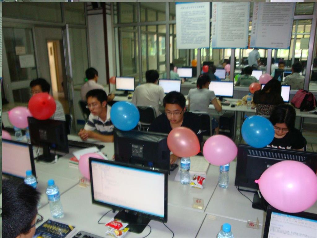 下午2时比赛正式开始,在三个小时的比赛过程中,共有6道程序设计题目,题目涵盖了程序设计语言数据结构和计算机算法,参赛的同学们按照自己能力完成各题目,大赛采用ACM评分规则,网上实时提交,由Judge Online系统自动判评。针对于此次普及组比赛情况,比赛试题难度较之去年明显降低,参赛选手每做出一道题,都会给解题正确的选手添加一个代表相应题目颜色的气球。这样不仅活跃了赛场氛围,同时给予选手适当的压力,使他们展现出更完美的竞技水平。大多数参赛选手答对了2道以上的题目。