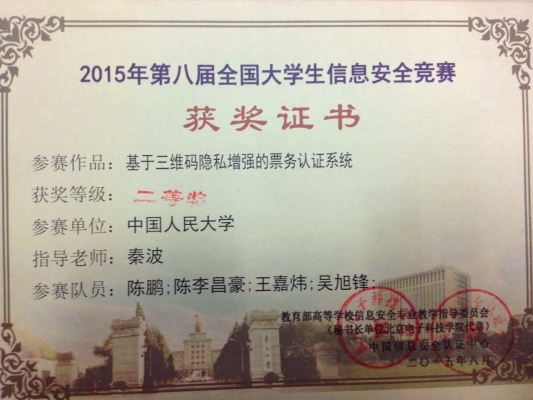 获得二等奖的参赛作品之一为《基于安全三维码的票务实名认证系统》,集安全三维码的生成、手持终端的识别、服务器端的身份认证和权限检查于一体,着重保护用户的个人隐私,为售票方和购票者提供了安全有效的实名认证环境。该参赛队由陈鹏、陈李昌豪、王嘉炜、吴旭锋等四位同学组成,指导教师为beat365官网信息安全专业教师秦波博士。