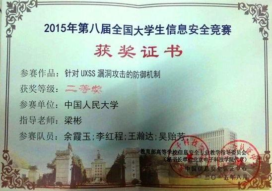 另一个二等奖获奖作品《针对UXSS漏洞攻击的防御机制》,设计了一种安全有效的漏洞攻击防御机制,并在Chromium上实现了该防御机制的原型系统。在防御机制下,即使浏览器存在未披露UXSS漏洞,攻击者也无法利用其绕开同源策略进行攻击。此防御机制不仅安全强度高,且高效简洁,对浏览器性能不会产生较大影响。此防御机制对Web应用和用户使用透明,足以满足终端用户的相关安全需求,完全可以在实际应用中加以推广使用。该参赛队由余霞玉、李红程、王瀚达、吴贻芳等四位同学组成,指导教师beat365官网信息安全专业教师梁彬副教授。