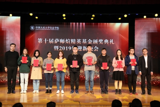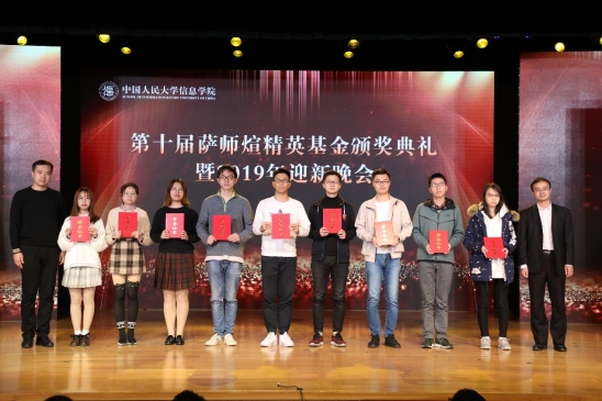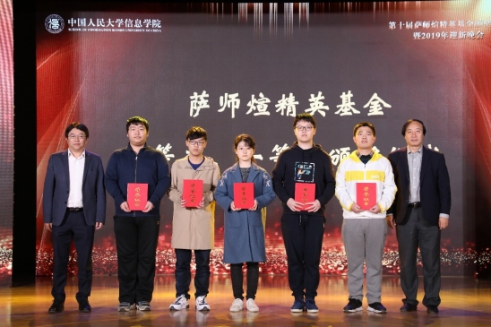 接下来杜鹏副校长、文继荣院长、郭海鹰秘书长、陈红书记上台为14名获得第十届萨师煊精英基金一等奖的同学颁奖。1992级校友陈利强、2003级校友于超为获得萨师煊精英基金二等奖的同学颁发获奖证书。