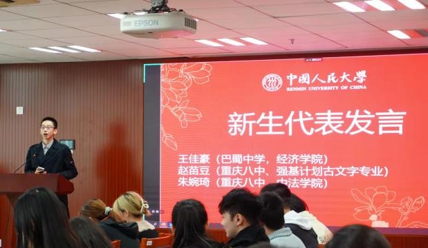 2021级本科新生代表经济学院王佳豪、强基计划古文字专业赵苗豆和中法学院朱婉琦三位同学分享了他们初入人大的学习生活感受。王佳豪同学从“不一样的大学生活”谈起,表示在来到人大、接触来自各地的同学后,其眼界变得更加开阔。深刻的新生入学教育、多样的校园活动也加深了他对“人大人”身份的认同感;赵苗豆同学则结合其“强基计划”经历,分享了自己从录取、报道到入学的全过程。幽默、接地气的发言传达出她对大学生活的期盼;中法学院朱婉琦同学用“温暖”、“热爱”、“未知”、“全面”四个词概括了自己初入校园的感受,她总结到,开启大学的新篇章或许迷茫无措,但一定未来可期。