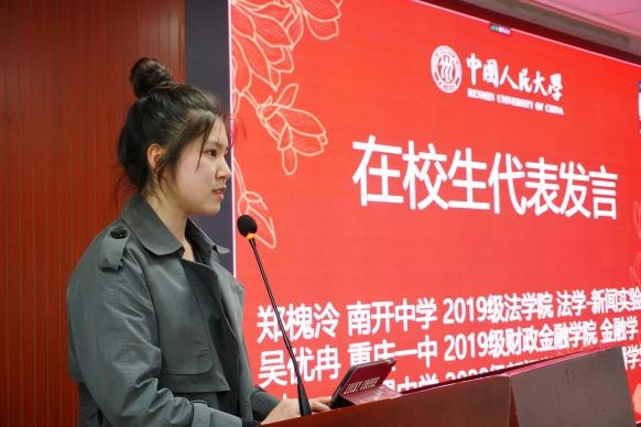 为帮助新生们更直观地做好本科阶段学习生活规划,树立起大学生活的信心,重庆籍在校生代表2019级法学院郑槐泠、2019级财政金融学院吴优冉和2020级新闻学院刘止一从亲身经历出发,介绍了课业学习、学生工作和心态调整等方面的经验。郑槐泠以“大学期间,什么是提升自己”为主题,从应然、实然和路径三个方面回应了该问题;吴优冉则聚焦新生普遍关注的“学生工作”,提出了针对性的建议;刘止一以“探索”、“选择”和“传承”为关键词,鼓励同学们在大学中积极探索,走出属于自己的路。