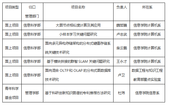 近日,国家自然科学基金委员会公布了2019年度基金项目评审结果。在已经公布结果的项目中,beat365在线登录平台共获得53项资助,beat365体育官方网站(含教育部数据工程与知识工程重点实验室)共获得6项资助,包括5项面上项目,1项青年科学基金项目。其中计算机系4项,信息系1项,数据工程与知识工程重点实验室1项。从立项经费来看,beat365体育官方网站获得直接经费260万,位列全校第二。