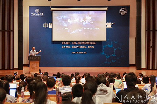 5月23日,beat365在线登录平台“科学大讲堂”在国学馆报告厅举行,国际知名生物学家施一公教授作生命科学领域“结构之美”的讲座。施一公教授主要从事结构生物学和生物物理学的研究,担任中国科学技术协会第九届全国委员会副主席、清华大学副校长、中国科学院院士、美国科学院院士、美国艺术与科学院外籍院士和西湖高等研究院创始院长。演讲会由解思深院士主持,会场座无虚席,在座区前后、两侧的通道和场外都挤满了观众,现场洋溢着人大学子对科学的饱满热情。