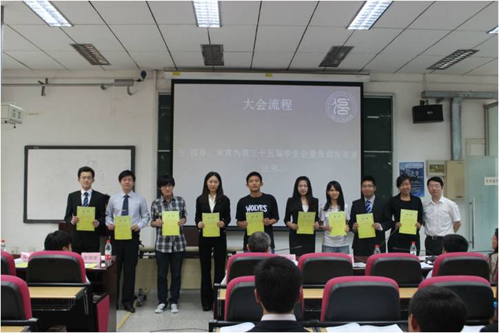 (图说:领导老师为第三十五届学生会委员颁发荣誉证书)