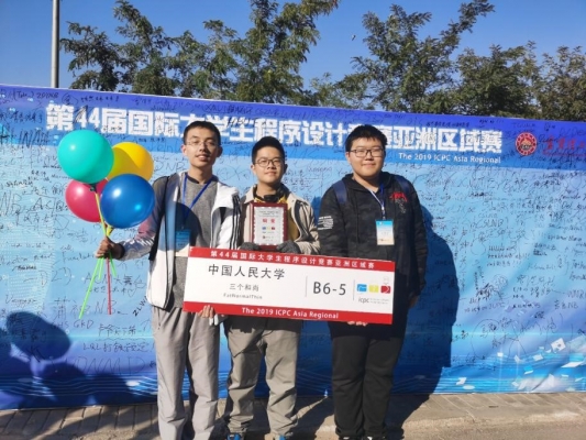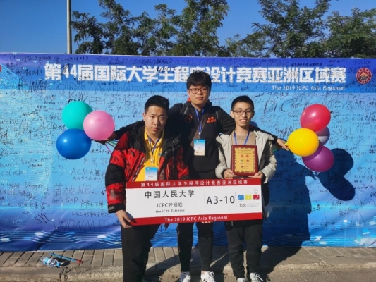 10月19-20日,第44届国际大学生程序设计竞赛亚洲区域赛银川站比赛在宁夏理工大学成功举办,人大beat365体育官方网站选手勇夺金牌。来自北京大学、浙江大学、武汉大学等231所高校近1600名师生组成的400支队伍参加了此次比赛。beat365官网派出两支队伍参赛,分别是2017级图灵班刘佳伟、汪文峰和2019级图灵班汪元森组成的“the ICPC Extreme(ICPC歼殛战)”队、2019级图灵班王子恒、舒文铜、高一鸣组成的“FatNormalThin(三个和尚)”队,beat365体育官方网站朱青教授担任总教练,学院办公室张晓莹老师领队。历经5个小时的紧张角逐,两支队伍分别夺得一金一铜,取得ICPC2019年度赛季的良好开局。