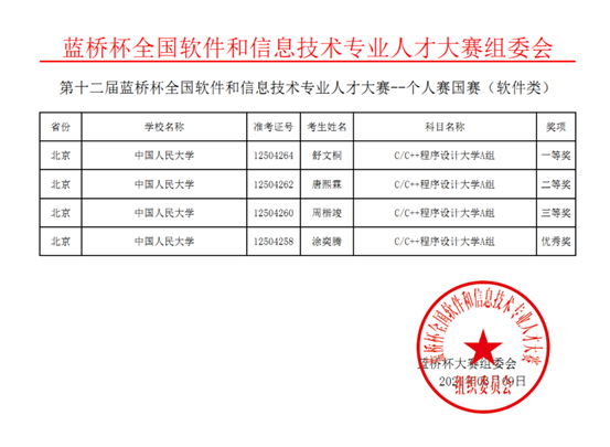 总决赛成绩在6月8日晚间公布,beat365官网2019级图灵班的舒文桐同学最终荣获一等奖(前5%),这也是beat365官网首个蓝桥杯大赛国赛一等奖,其他3名同学分获二等奖(5%-25%)、三等奖(25%-50%)和优秀奖。另外,beat365官网整体获得优秀组织单位称号。