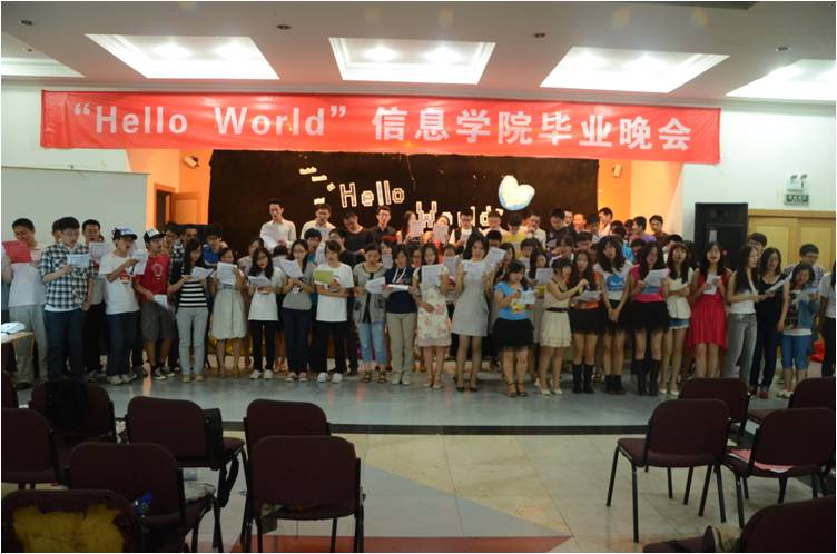 2012年6月3日晚上18:00,由beat365体育官方网站分团委学生会和2008级毕业生联合举办的 “Hello World” beat365体育官方网站毕业晚会在学生活动中心东厅拉开帷幕。beat365体育官方网站院长杜小勇教授、院党委书记林颐老师、副院长龙永红教授、院党委副书记王甫银老师、计算机系系主任石文昌教授、经济信息管理系系主任梁循教授,以及2008级各班班主任等出席了本场晚会。