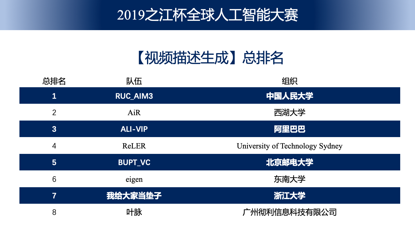 10月16至18日,第二届之江杯全球人工智能大赛决赛在杭州顺利举办。金琴副教授团队在技术挑战赛视频描述生成赛题上,成功在214个队伍中脱颖而出,勇夺冠军,并获得30万人民币的奖金奖励。这是金琴副教授团队继MSR “Video to Language” Grand Challenge,CVPR ActivityNet “Dense Video Captioning” Challenge,NIST TRECVID “Video to Text Description” Challenge等国际赛事连续夺冠后,再次在该任务上夺得冠军,展现了该团队在图片/视频描述生成领域领先的科研水平。此次参赛队伍学生成员包括:宋宇晴,赵一达,陈师哲。