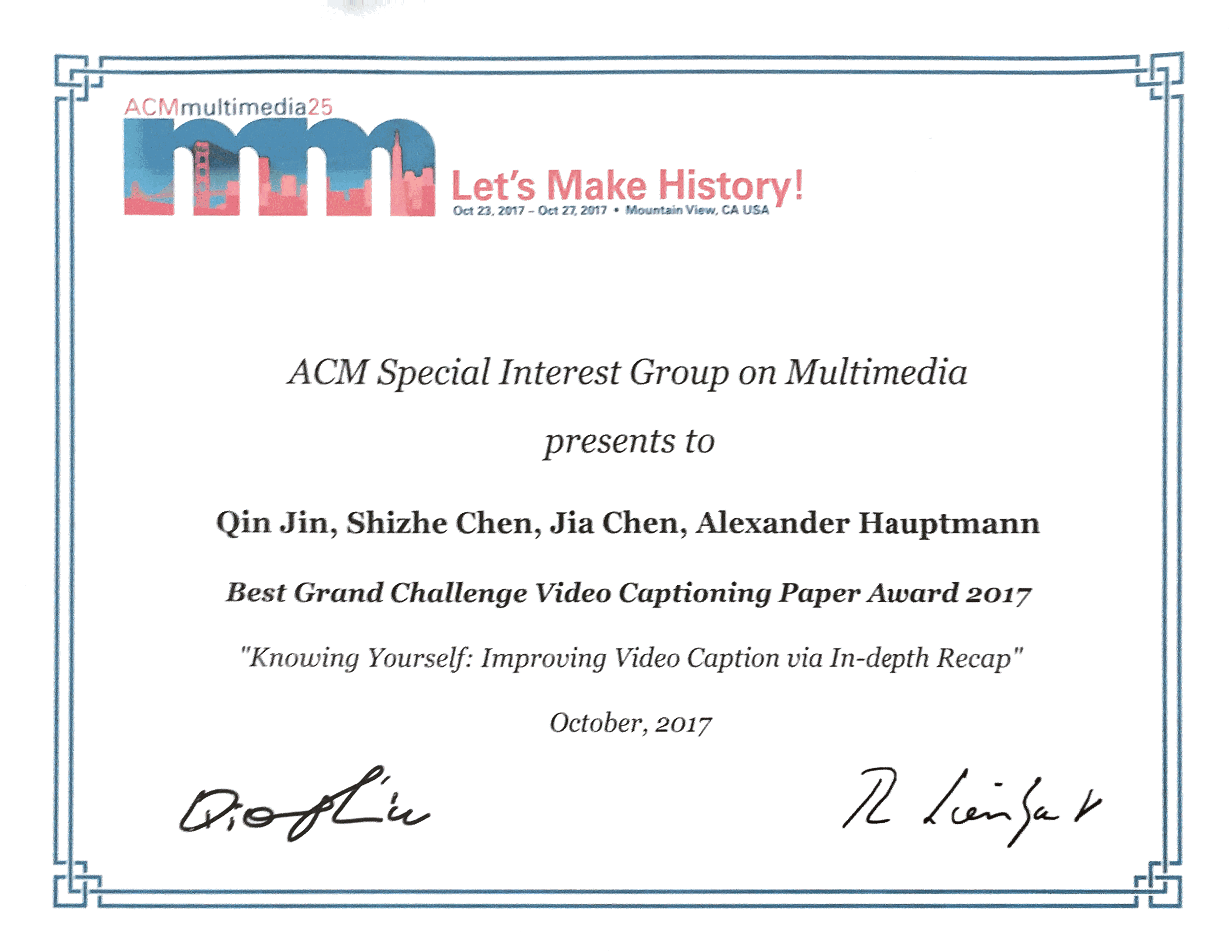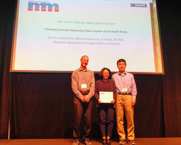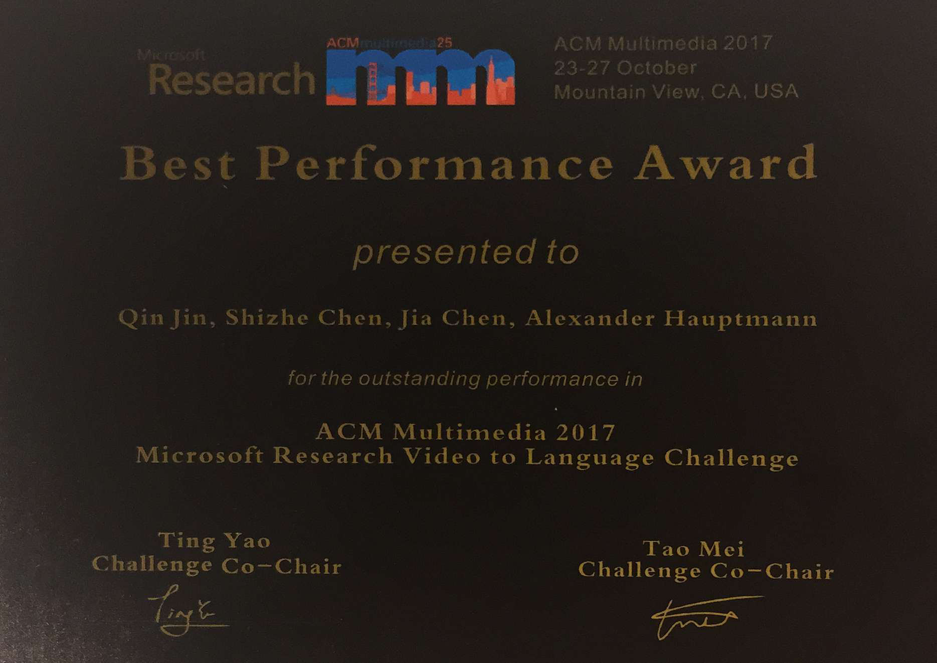 金琴老师团队参加的MSR video to language(MSR-VTT)赛题自2016年来已连续举办两届,其任务为自动地为短视频生成自然语言视频内容描述。今年共有全球57支队伍注册参加。金琴老师团队在去年MSR-VTT比赛中已取得第一名的佳绩,在此基础上,今年该团队继续对视频内容描述任务深入攻关,创新地提出了基于隐含主题指导的视频内容描述生成模型,并通过排序和融合等方法综合利用多个不同视频内容描述模型,在MSR-VTT上继续领先,取得了主观人工评测和客观性能评测的双冠军,荣获Best Performance Award。