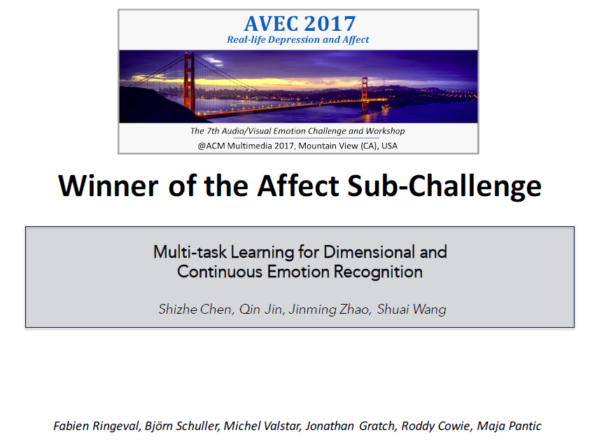 此外,该团队荣获国际听视觉情感计算挑战赛(Audio-Visual Emotion Challenge AVEC 2017)冠军!