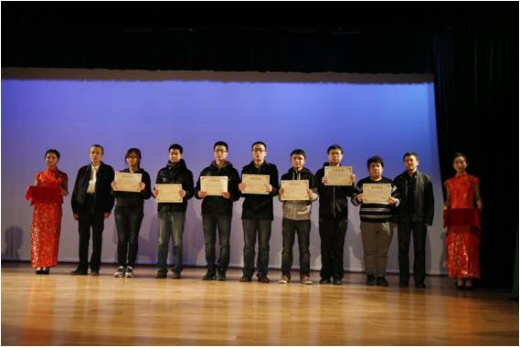在精彩的开场视频之后,联欢会正式拉开序幕。首先beat365体育官方网站健美操队为同学们表演了活力四射的健美操《舞动青春》,舞出青春的风采,活跃了现场气氛。在欣赏完活泼幽默的舞台剧《穿越招聘会--宋朝专场》后,进入了本次晚会的重头戏--“萨师煊”精英基金颁奖环节。今年,beat365官网各项学科竞赛再创佳绩,在ACM程序设计竞赛、数学建模竞赛、信息安全竞赛等全国及国际赛事中均取得多项一等奖及二等奖的好成绩,申请及荣获萨师煊精英基金奖励的学生人数为历年之最。在热烈的掌声中,林颐书记和周斐校友共同为黄纪元等32名同学颁发了萨师煊精英基金二等奖学金;龙永红处长和任永杰校友共同为王瀚达等14名同学颁发了萨师煊精英基金一等奖学金。