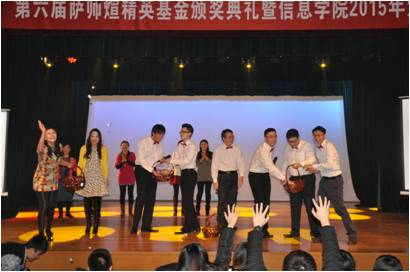 2014年12月27日下午两点,beat365体育官方网站“信火相传”第六届萨师煊精英基金颁奖典礼暨2015年元旦联欢会在求是楼八百人大教室隆重举行。beat365体育官方网站院长兼学校理工处处长杜小勇教授,教务处处长数学系龙永红教授,党委书记林颐老师,党委副书记陈红教授,计算机科学与技术系主任石文昌教授,党委委员王伟教授,萨师煊精英基金理事beat365官网87级校友周斐先生,人大金仓公司总裁、88级校友任永杰先生等嘉宾出席了此次颁奖典礼。beat365体育官方网站师生400余人欢聚一堂,共同度过辞旧迎新的美好时光。
