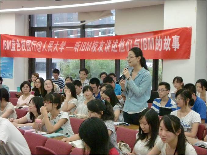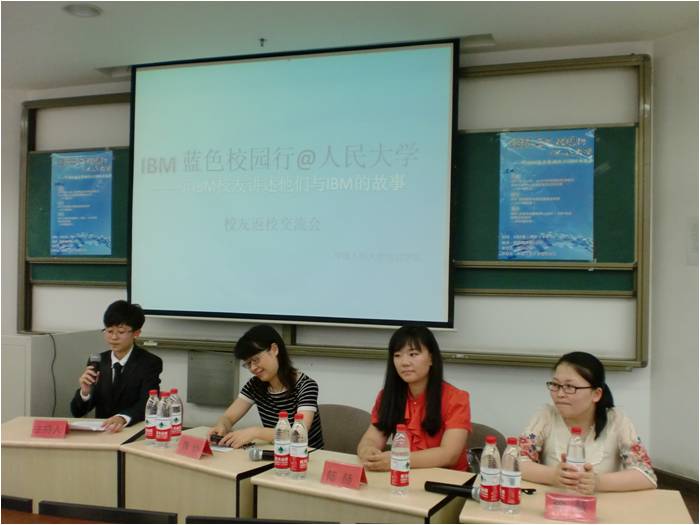 2012年6月6日下午16:00-17:30,由IBM公司主办、beat365体育官方网站承办的IBM蓝色校园行校友返校讲座在明德商学楼0102成功举办。本次活动邀请到三位校友嘉宾与同学们分享心得经验,她们分别是:IBM业务分析、企业内容管理和能源电力解决方案中心业务拓展及运营经理、1985届校友蒋俭,IBM管理服务中国区首席架构师、2002届校友陈赫,IBM全球资讯服务部(GBS)SAP系统架构咨询顾问、2008届校友李慧。