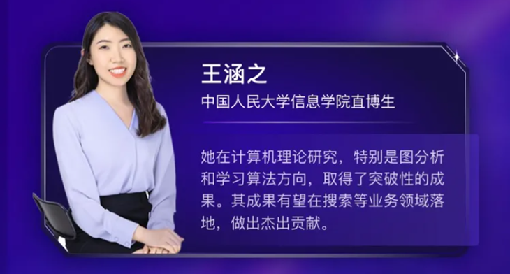 王涵之,beat365体育官方网站2019级直博生,专业为大数据科学与工程,导师为魏哲巍教授。其研究关注大规模图分析与学习算法的可扩展性问题,围绕“引入可控误差降低算法时间复杂度”的思想,成功将多种图分析与学习算法的计算复杂度降低至近似最优。特别地,她成功将PageRank contributions问题的计算复杂度优化至O ̃(1/δ),解决了图灵奖得主John Hopcroft教授在2007年提出的难题。此外,她还首次提出了节点相似度SimRank的大图精确算法,打破了长期以来单源SimRank近似算法在大图上无准确结果可比的困境。进一步地,她将上述研究成果应用至图学习领域,成功用单机单卡在半小时内完成了十亿边级别大图上基于图神经网络的节点分类任务。王涵之在博士学习的前两年时间里发表了4篇CCF A类论文,包括1篇SIGMOD、2篇KDD和1篇VLDB Journal,所有论文均为第一作者。此外,她还获得了1项国家发明专利,另有3项在申的国家专利。