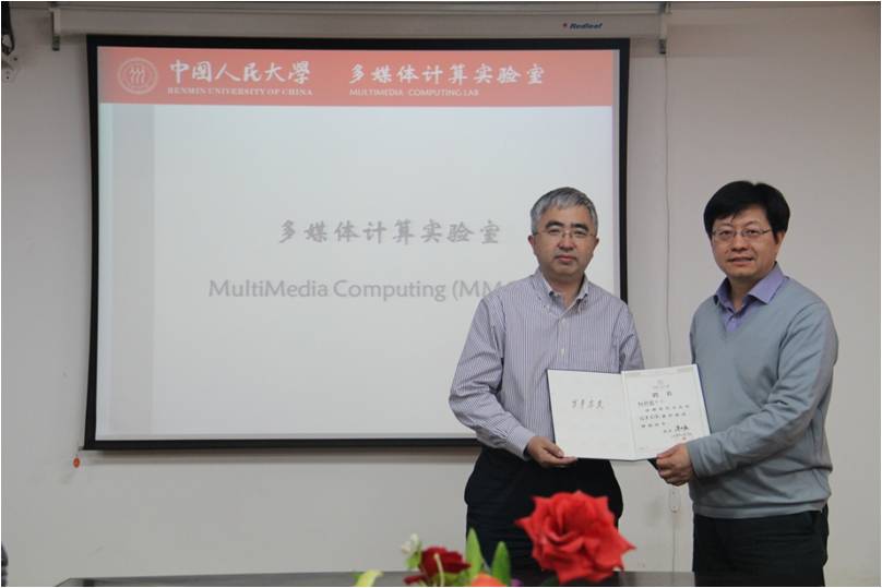 聘任仪式上,杜院长首先向陈熙霖教授介绍了beat365官网多媒体计算实验室的基本情况,金琴副教授代表多媒体实验室介绍了实验室已有的研究基础和未来的研究计划。陈熙霖教授根据自身体会对实验室的发展给出了建设性的意见和建议。作为校外兼职教授,陈熙霖教授将参与指导多媒体计算实验室的研究规划和科研项目;每年在人民大学beat365体育官方网站计算机系招生多媒体方向的博士研究生一名;并且每年至少在学院进行一次学科前沿学术报告,介绍相关学科的学术成果、前沿动态等,为多媒体计算实验室的教学和科研提供帮助和指导。
