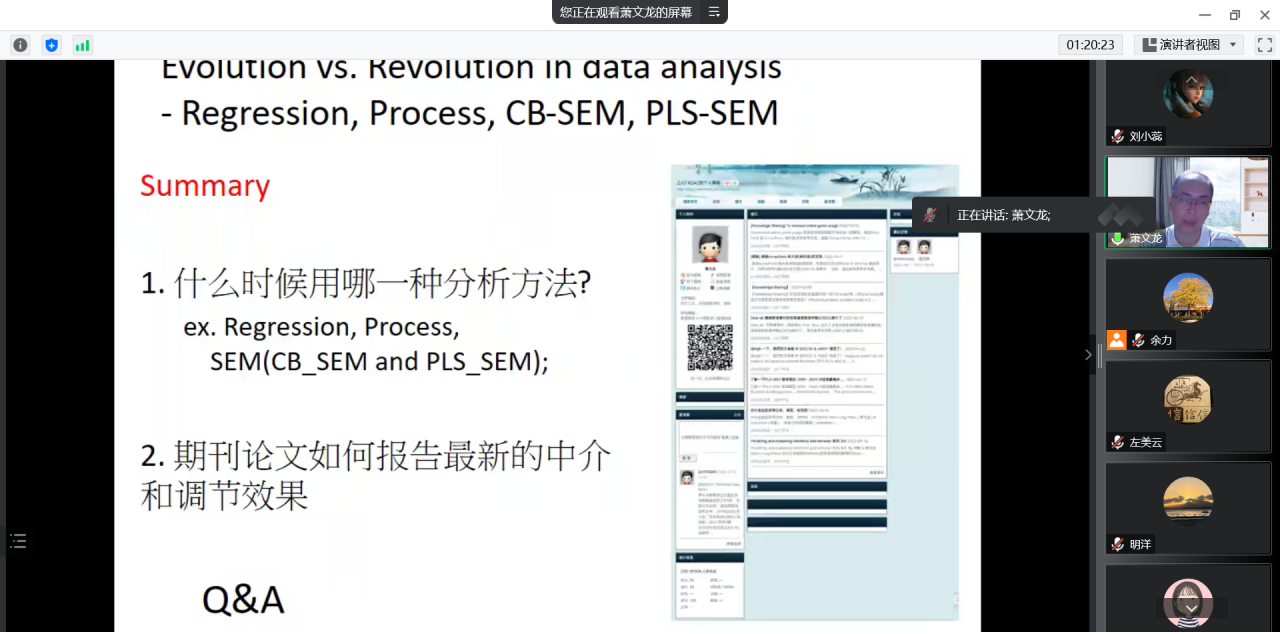 萧文龙教授的讲座内容主要分为计量实证分析方法使用回顾与期刊论文中中介和调参效果撰写两部分。在计量实证分析方法回顾方面,萧老师首先系统的回顾了统计分析技术的发展历程,他认为发展分为两个阶段,第一个阶段的统计分析以单一层级的分析为主,主要使用的是ANOVA、MANOVA、回归等方法,分析工具以PROCESS为主;第二阶段则主要是通过SEM模型分析多个自变量与依变量之间的复杂模型关系。然后着重对目前计量分析中普遍使用的SEM模型进行了详尽的阐述,他提到目前的SEM模型分为CB-SEM和PLS-SEM。CB-SEM适合于理论模型的检验(验证性),可以使用LISREL、EQS和AMOS软件来构建;PLS-SEM适合于理论模型的建置(探索性),可以使用PLS和PLS-Graph来构建。使用过程中要尤其注意SEM模型的适配度指标值。最后讲述了Regression, PLS, LISEL等的适用情景以及优缺点。在期刊论文中中介和调参效果撰写部分,萧老师以自己做的研究为例,从提出假设、构建模型、模型间关系分析等方面详尽的阐述了如何根据数据和模型场景设置中介变量和调整模型中的参数。在问答环节,同学和老师就PLS-SEM的适用场景,模型构建中变量的影响关系判断等进行提问,萧老师建议综合数据、具体研究场景和结论等进行分析。