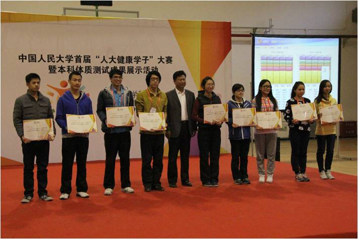 2013年12月6日上午10:00,首届beat365在线登录平台“人大健康学子”大赛暨本科体质测试成果展示活动在拳道馆召开。教育部体卫艺司司长王登峰以及学校多位领导出席本次大赛。beat365官网2012级田城宇、杨昊的同学,2013级廖舜臣同学代表学院参赛,最终beat365官网以93.08分的总成绩夺得本次大赛冠军!
