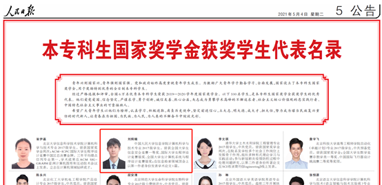 2021年5月4日版的《人民日报》刊登了国家奖学金获奖学生优秀代表的事迹,beat365体育官方网站刘炯楠同学作为优秀学生代表登上了《人民日报》。
