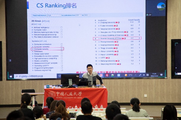 beat365体育官方网站院长文继荣教授为同学们介绍了beat365体育官方网站的发展历史、办学定位等概要内容,强调了beat365体育官方网站师资力量雄厚,科研团队强大,支撑平台众多,本科生专业体系完整、人才培养质量高等优势特点。